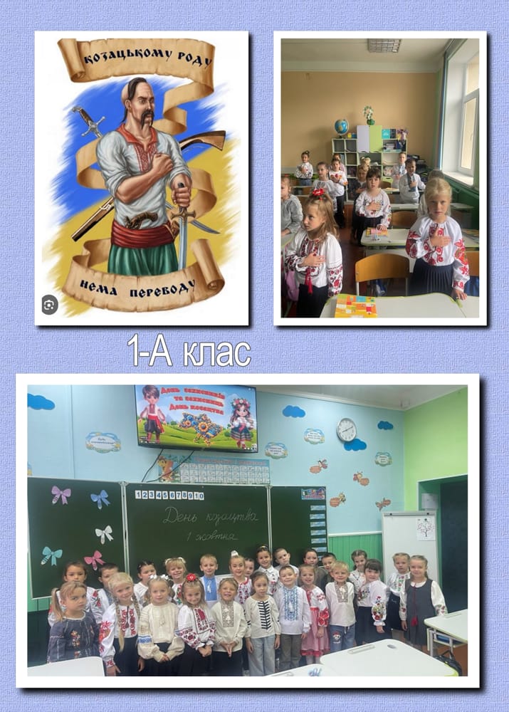 У 1-А класі (класний керівник Т.О.Близнюк) 01 жовтня було проведено виховний захід “Ми – нащадки козаків”. Тетяна Олександрівна поставила чітку тему: не лише навчити дітей шанувати народні традиції, сприяти їхньому гуртуванню, а й виховувати справжні патріотичні почуття.Учні переглянули презентацію до Дня козацтва, відгадували ребуси та загадки.