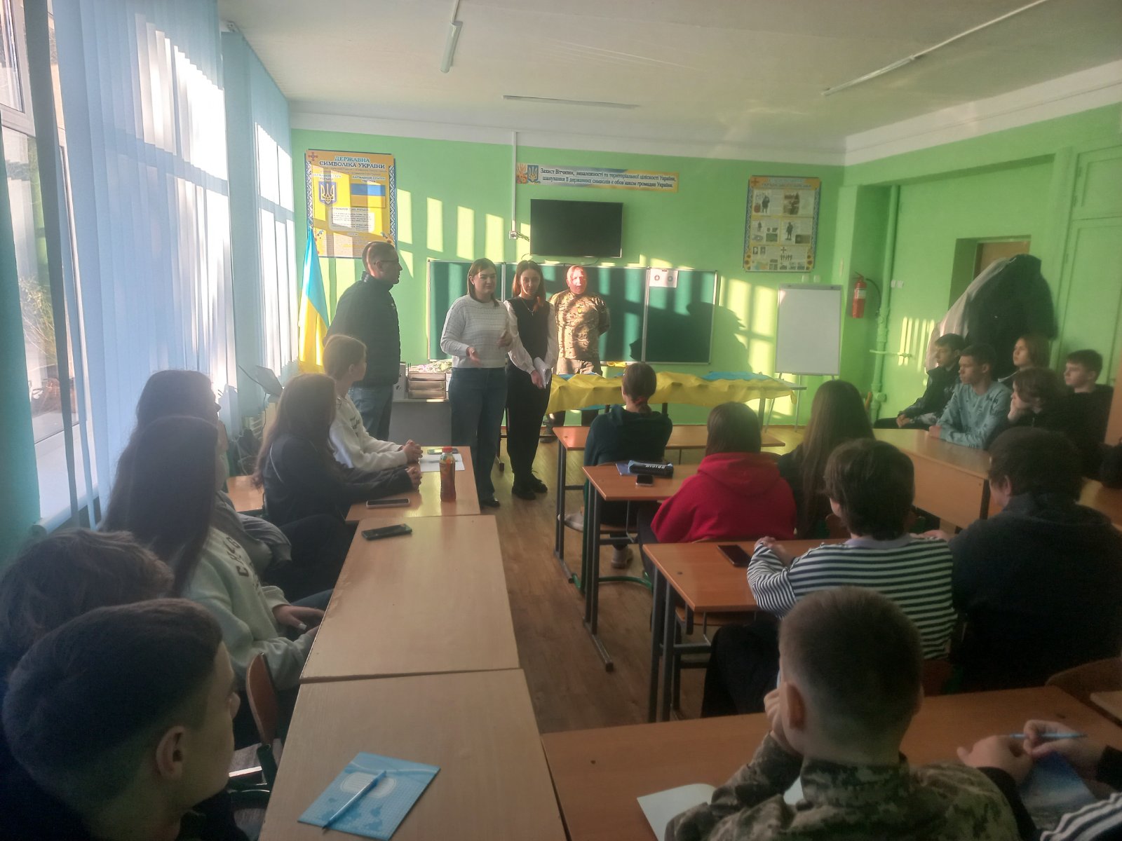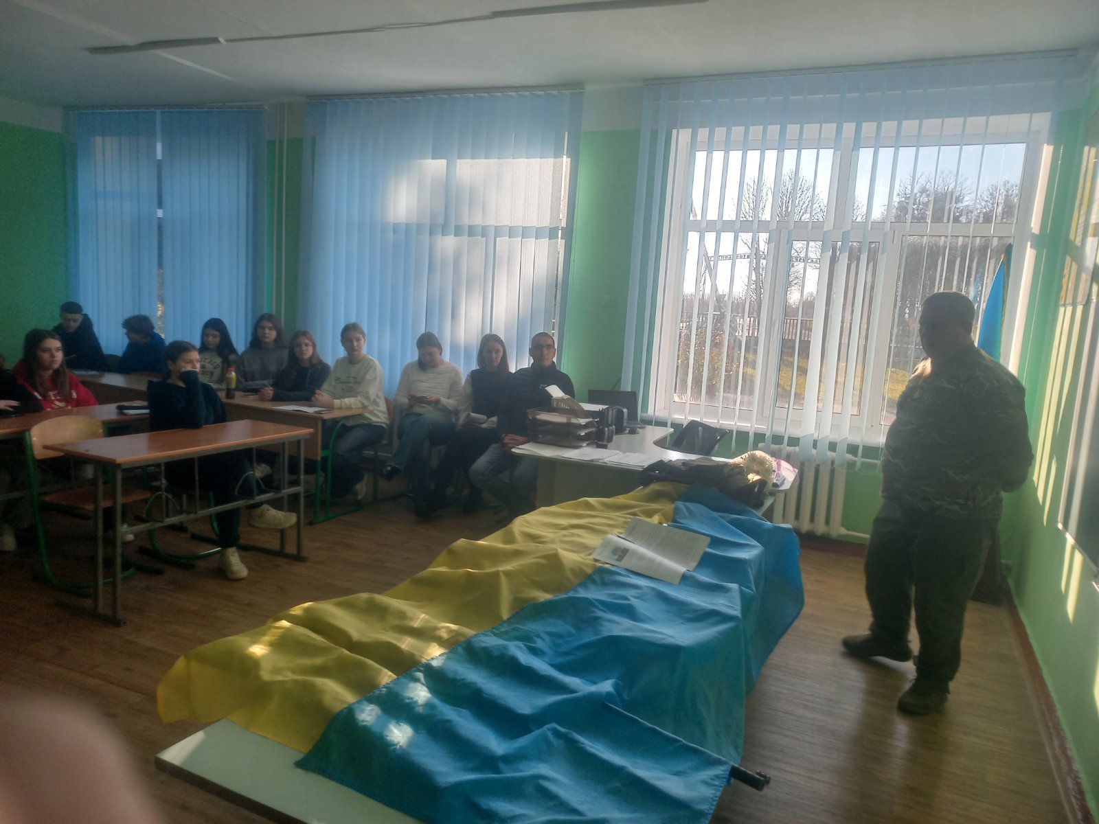 24 листопада учителі ліцею Сергій Іванович Гуленко та Володимир Михайлович Кутовий організували зустріч здобувачів освіти осередку для викладання захисту України із ветераном війни Юрієм Коропом, координатором із взаємодії з військовими та ветеранами БФ «МХП -Громаді»; фахівчинями із супроводу ветеранів війни та демобілізованих осіб ветеранського простору «Ветепан Pro» КУ «Миронівський центр надання соціальних послуг» Аллою Дмитренко та Людмилою Шустовіцькою. Юрій Короп повідав учням, що на відміну від традиційного уявлення про ветерана як “учасника минулого”, ветеран Війни за незалежність – це учасник теперішнього. Його досвід не завершується демобілізацією. Він несе в собі системні знання про нову форму конфлікту – багатодоменну, де реальний і віртуальний фронти злиті воєдино. Виступаючі А. Дмитренко та Л. Шустовіцька пояснили здобувачам освіти, як рішення в соцмережах можуть коштувати життів, як інформаційний вкид паралізує тил, як точність дронів чи цифрових карт змінює тактику бою. Лектори акцентували, що цей досвід є унікальним і сьогодні спілкування з носієм такого досвіду є важливою складовою у підготовці до національного спротиву.