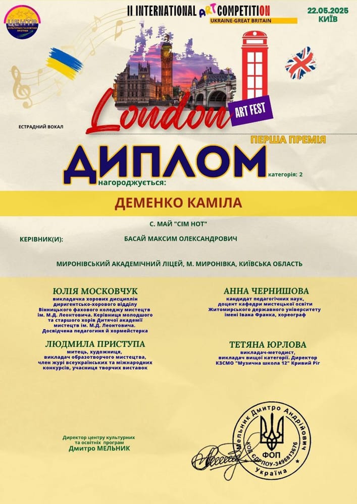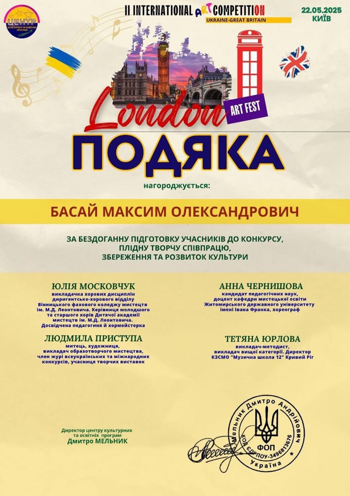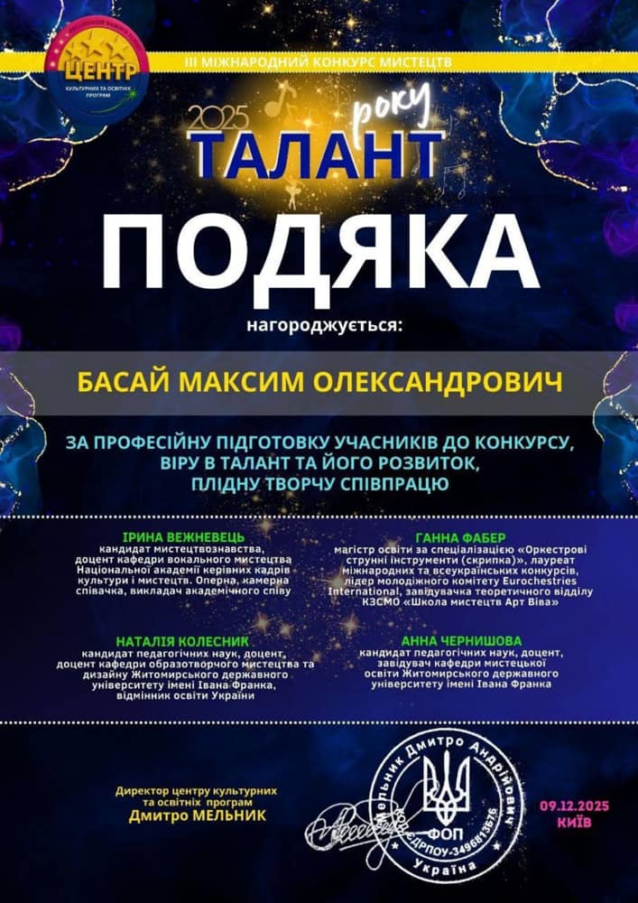 Вітаємо учасників вокального ансамблю «Унісон» (гран-прі), ученицю Сабадин Дарину (перша премія) та керівника – учителя музичного мистецтва Максима Олександровича Басая, які успішно виступили в ІІІ Міжнародному конкурсі мистецтв «Талант року – 2025». А також Романенко Марію та Деменко Камілу (перша премія) в номінації «Естрадний вокал». Наш заклад пишається вами!